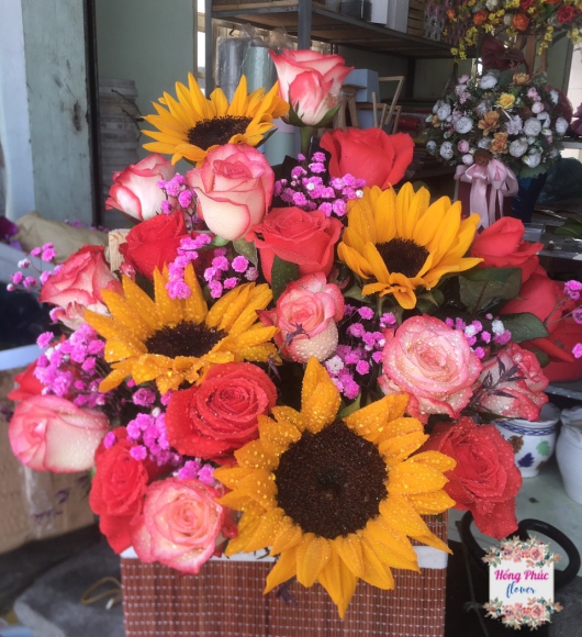 GIỎ HOA HỒNG PHỐI HƯỚNG DƯƠNG TẶNG THÔI NÔI TÂN UYÊN
