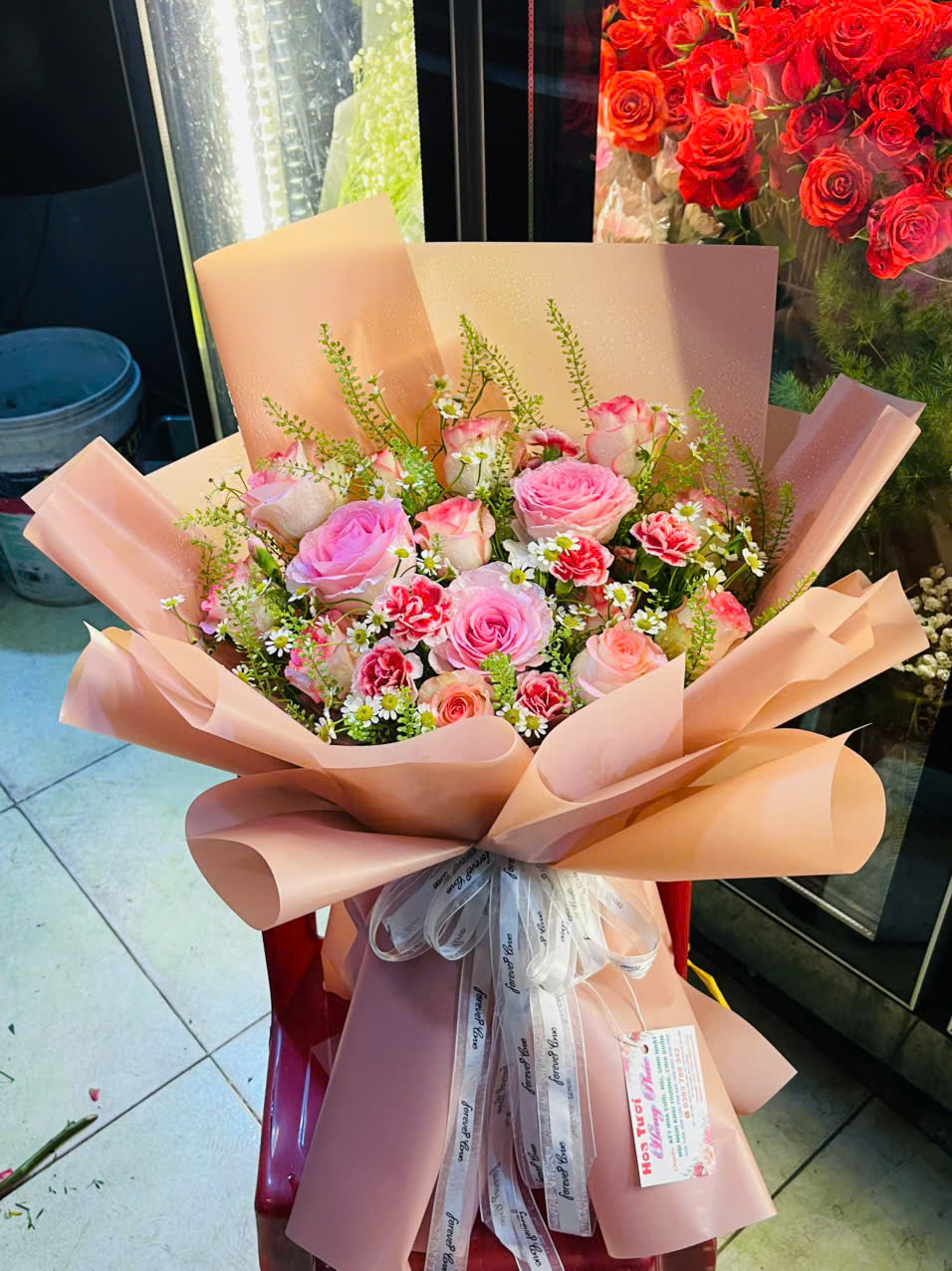 • Bó hoa kèm phụ kiện: Như nơ satin, dây ruy băng, hoặc thẻ chúc mừng cá nhân hoá, tăng tính độc đáo.